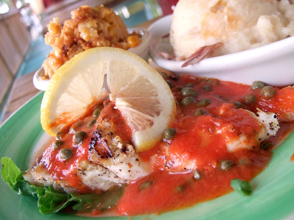 I chose a self-proclaimed house specialty: one of their catches of the day, grilled or blackened, with mashed potatoes, your choice of side and sauce -- tomato caper, lemon dill or creamy citrus. Grouper, grilled, tomato caper, corn casserole. The grouper was solid, but I didn't enjoy it as much as the shrimp or my ladylove's sandwich. I found it a little tough, but not overly so, and I would've felt better about a fresher tomato sauce. It was cooked down to an intensity that I thought detracted from the fish a bit, but it was still quite good. The corn casserole? Ho, buddy. A big winner. Moist, mushy, sweet and utterly comforting.