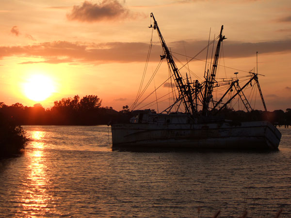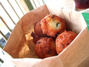 Rusty Bellies, a relaxed little joint sitting on a small inlet of water. The big draw here was that the folks at Rusty Bellies do their own fishing. Heck, they built the boats! The boats go out in the morning and return with the restaurant's supply for the day. It doesn't get much fresher than that. The view and scent from the deck were airy and refreshing at sunset (a good thing, since our server left us languishing for nearly half an hour), and dinner was right on the money. I've had hush puppies before, but the ones that hit the table immediately after we sat down tried to convince me otherwise. A beautiful start.