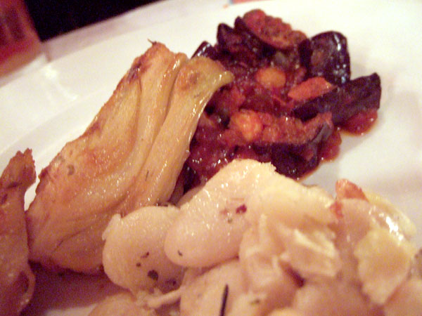 Cafe Fiorello's biggest strength, arguably, is a jaw-dropping antipasto bar. I almost hesitate to call it such, since a "bar" of anything conjures up images of forlorn items under heat lamps and public health hazards. "Spread", though crude, might be a little more appropriate, since you stare slack-jawed at a vast expanse of antipasti of every kind while a server patiently awaits your selections before filling your plate for you. Going to Cafe Fiorello simply to make a meal of antipasti is an entirely legitimate endeavor. There are about two dozen selections that rotate on a daily basis, and at times I've toyed with the idea of working my way through the entire table in one sitting. It might require a midday fast and a couple of like-minded companions, but it's entirely doable. This is a quest upon which I've not yet mustered the discipline to embark, but one must have goals. On this particular evening, I selected some Tuscan white beans, lightly dressed and tender yet toothsome, a bold caponata overflowing with sweet and sour, and caramelized fennel that might have become the sole component of my entire dinner if I hadn't already ordered.