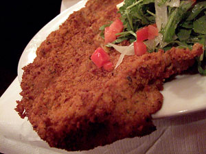 My ladylove had one of their excellent pizzas, paper thin and the size of a manhole cover. When I say paper thin, I don't exaggerate as much as you think. Cafe Fiorello's is, by far, the thinnest pizza I've met. I don't note this as an indication of excellence, merely a statement of fact, yet excellence abounds. It's simple, fresh, vibrant, and one of the lightest pizzas you'll ever meet. Don't let the surface area fool you into thinking you'll need help with it. Sadly, an old favorite, the lobster and truffle pizza, seems to have been removed from the menu. Thankfully, my favorite dish remains. Cafe Fiorello does a dynamite veal chop Milanese. It's pounded out to the size of a serving platter, more a function of its thinness than the size of the chop, and served bone-in with lightly dressed arugula and tomato on top. This, for me, is the veal Milanese by which all others are judged. They season it beautifully, keep the meat moist and tender and the breading crisp, and dress it up just a touch without gilding the lily, I love this dish.