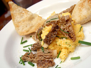 Top the eggs with the morels, the parmigiano reggiano and the rest of the chives, and serve with toast.