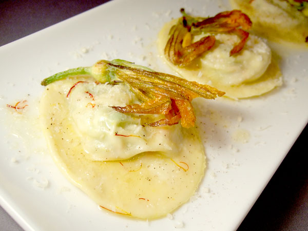Once your pasta water has a nice rolling boil going, drop in the ravioli, give them a stir, and boil them for just a couple of minutes until the pasta is cooked and the filling is warmed through. Fresh ravioli cooks very quickly -- it'll only take a couple of minutes. Drain the ravioli thoroughly, transfer them to the skillet with the saffron butter and toss them to ensure they're coated all over, then plate them with a tiny bit of freshly ground black pepper and a light sprinkling of the grated pecorino, and top them with the fried blossoms. Spoon the excess saffron butter on and around the ravioli, and get 'em on the table.