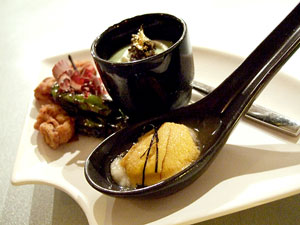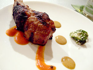 Despite the fishy focus, Fukuda doesn't leave carnivores out in the cold. I'm at a loss to describe what's Japanese about the lamb course, but it was good enough that I don't really care. Two ribs worth of rack are grilled with a coconut curry marinade, then plated with a roasted red pepper coulis, curry reduction and pickled cucumber -- the last of which I suppose is the answer to the "what's Japanese about this dish" question. This isn't the most sophisticated dish of the bunch. It's fairly simple and straightforward. But the bold flavors combined with an absolutely perfectly grilled chunk of crispy, juicy, just-the-right-amount-of-fatty lamb makes it a bone sucker. It's more a triumph of execution than conception, but that's absolutely no less welcome.