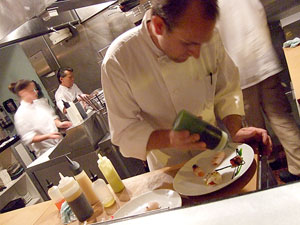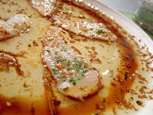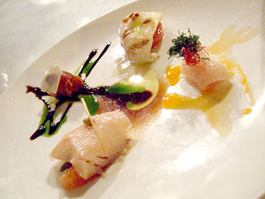 The ingredient list on the whitefish carpaccio belies its subtlety. Ultrathin hirame is served swimming in a sea of roasted garlic oil, sesame oil, soy sauce and sesame seeds. But despite these bold flavors, the fish -- ever so lightly cooked on the edges by the heat of the oil -- maintains its identity. And just when you finish off the last bit of fish and start asking yourself why they drown the fish in three gallons of oil when a few drops would probably do, you're presented with a steaming hot freshly baked green onion focaccia that -- moist and spongy -- is perfect for mopping up what's left on the plate.