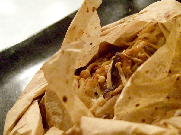 favorite ways to prepare mushrooms, as it concentrates and intensifies the flavors while keeping them tender and moist. Here, shiitake, enoki and shimeji mushrooms are sealed up with sake, soy sauce and garlic butter and baked until the parchment puffs and scorches. It's then plated, sliced across the top, and served as-is for you to dig into.