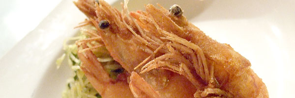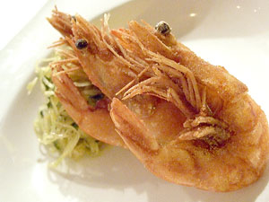 After that remarkable flurry of ingredients (it's a wonder they can assemble that dish in less than an hour), the menu took a baby step back in terms of complexity, though it was still an impressive exercise in precision. Soft-shelled shrimp were "breaded" in an almost powder fine crumb that had been seasoned with ginger, garlic and soy before being crisp-fried hot enough that the little critters were completely edible, tip to tail, shell and all. Again, working the textural and temperature contrasts, Fukuda paired this with a cool salad of shredded green papaya, very sparingly seasoned with a touch of curry to bridge the gap with the hot and crispy shrimp. Even if I weren't already a long time fan of chitin and on a total shrimp head kick at the moment, this dish would have thrilled me. It was beautifully conceived and crisply executed.