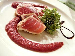in my own cooking. Slices of bigeye tuna are lightly seared and seated atop a beet puree that's made with a pinor noir reduction, then accompanied by microgreens dressed with yuzu and a balsamic reduction. I can see how some might think there's something inelegant about the unabashed sweetness of the beet puree, but this is just a flat-out delicious dish and results trump all. I was really taken aback the first time I was presented with this beet and raw tuna pairing, and the fact that it still strikes me all these years later as fresh and unusual says something, I think. In any case, the pinot noir reduction adds some body, the yuzu adds brightness, and the balsamic reduction keeps the sweetness from being too one-dimensional. Like so many of Fukuda's other dishes, it demonstrates that you can bring bold flavors without overpowering the delicate fish if you do so carefully and thoughtfully.