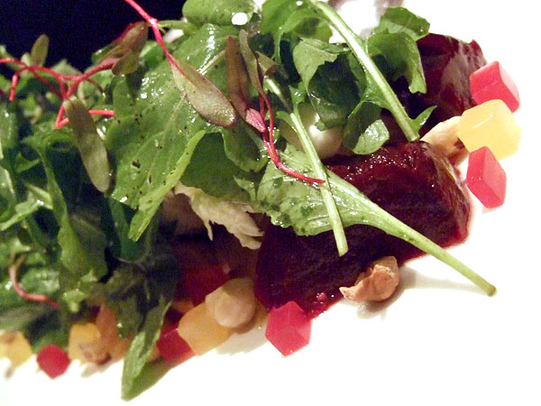 The country pâté, served with mustard, cornichons, toasted bread and watercress, was an exceptional little number that may have been my favorite of the evening. Lacking an organ component and composed solely of pork shoulder and another cut I missed, it was studded with sage and possessed of a fresh, porky sweetness that was further enhanced by the inclusion of diced dried apricots. Its composition was so exceptional, in fact, that this condiment fiend found the accompaniments to be largely superfluous. Meanwhile, the Jamie we've come to know and love on the show was on full display in the roasted beets, which were plated with a creamy burrata, toasted hazelnuts and pickled shallots, and buried under a pile of wild arugula that was dressed with a blood orange vinaigrette. Like the dishes we've seen on the show, this was fresh and seasonal, elevating exceptional ingredients with great care, but with enough of a personal spin -- the hazelnuts, shallots and meticulous dice on some of the beets -- to make it a little more than your typical roasted beet salad.