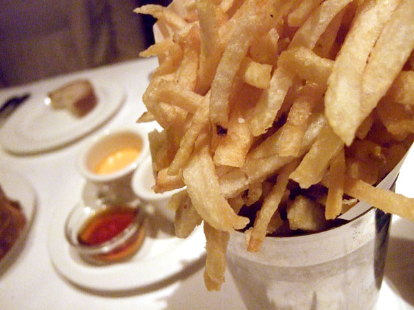 The spicy-fried chickpeas had come highly recommended from a couple of sources, and while they weren't quite the showstoppers I'd been led to believe they'd be, they were exceptionally fine specimens of the legume. Deep-fried, I presume, pleasantly spicy and seasoned with herbs, their smooth and borderline volcanic interior was encased in a lightly crisped shell that merited their presence on the snack section of the menu. That they were served in a small cup was probably a good thing. Large volumes of these would be dangerously easy to munch into oblivion. French fries were enjoyable and well-executed, if precisely what you'd expect (not that there's anything wrong with that), and accompanied by a trio of dips -- Dijon mustard, thyme-scented malt vinegar and a rather red rouille.