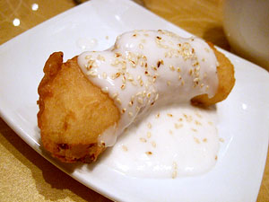 Dessert was one of the rare ones that I've found compelling. The first, "Golden Tropical Orchard Winter Roll", was one of those "Oh, wow" bites. A hot, crisply fried wrapper that encircled a frozen and exceptionally sweet filling, like a tropical ice cream with chunks of exotic fruit. The temperature and textural contrast was an absolute showstopper, and that they managed to somehow maintain that perfect balance in one package was an impressive technical feat, to say the least. Our last dish, though not nearly as showy as is predecessor, combined a simple banana fritter with a sweet coconut cream. I've had this and similar many times before, but rarely executed as well.