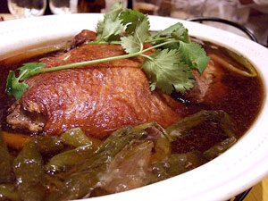 "Basking in the Summer Sun" was another of the evening's weak links, though it was not without drama. When the serving container arrives slathered in sterno, it's best to take cover. Once the smoke had subsided, however, we removed the beef in "chef's special sauce", rolled it in typical Vietnamese style with vermicelli, fresh herbs and vegetables in lettuce leaves and rice wrappers, and dipped it before consuming. The beef was fine, a sort of dark caramel flavor, but a little cloying and a little muddy. The star, in truth, was the dipping sauce. I couldn't begin to identify what was in it (well, okay... fish sauce... go!), but it was exploding with all kind of flavors, fresh herbs and aromatics in a sweet, salty and sour base. Too bad it wasn't served with a different dish. The "Imperial Delicacy Treasure", the last savory item of the evening and another off-menu special, was simultaneously one of the simplest of the evening and probably my favorite. It arrived, a whole duck with a deep bronze color, submerged in a huge tureen of dark duck jus, scented with a mix of aromatics that put bright highlights on the duck's sweet, mellow scent. We each received a small bowl of the jus and chunks of fall-apart tender duck. It was really, truly wonderful. It was the kind of dish you could spend ten minutes just breathing in before you even bring a spoon to it. And it was one of the least ostentatious of the evening.