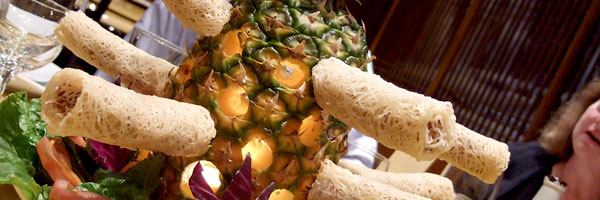 Our first dish, Golden Gems of the Atlantic, was a simple, if luxurious, start. Halves of bok choy, large mushrooms and huge slabs of abalone were simply braised in a warm, comforting sauce that felt very Chinese to me. I love abalone, and while I don't think I'd ever had it Stateside before this evening, I didn't come away the least bit disappointed. It was exactly what I've come to adore -- dense and meaty but possessing a hint of that subtle, unmistakable aquatic mollusk funk. There was nothing that wowed in this dish other than the ingredients themselves, which is probably for the best. Up next was the zany tiki totem meets Hellraiser presentation called "Silken Shawl Imperial Autumn Rolls". This was a hit and miss dish at the same time. While the unorthodox wrapper -- a light and crispy lattice of fried rice noodles -- was exceptional from a textural standpoint, that was pretty much the dish. The filling, comprised of shrimp and pork, was largely unremarkable. The most frustrating thing about the dish, really, was resisting the urge to turn off the lights and pop in some disco.