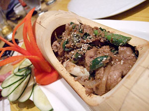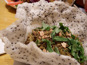 "Treasure from the Sea" was a fairly typical Vietnamese salad, atypically good, made with slivered pineapple, carrot, onion, lemongrass, peanuts, thin slices of squid and large poached shrimp. It was nicely balanced, very enjoyable, but the shrimp puzzled me, looking pretty perched on the edge of the pineapple, pale white and tied into little knots, and not dressed or integrated into the dish in any way. It would be the first time I thought the food took a bit of a backseat to the presentation. No such issues with "Smoky Petal", which was in the running for my favorite of the evening, if for no other reason than because it was completely foreign to me. An enormous puffed rice bowl -- think taco salad shell -- was filled with a warm salad of minced baby clams and ground beef, seasoned and tossed with peanuts and plentiful herbs I couldn't begin to identify. Though I lack the frame of reference to fully describe what I was eating, it was fragrant, a little funky, very much unlike anything I'd tasted before and I really, really enjoyed it. Long after the rest of the table had moved on, I parked it in front of myself and cleaned up.