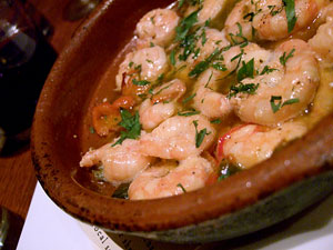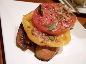 It being mid-August and all, we felt it would have been irresponsible not to order something with fresh tomatoes, so we fulfilled the obligation by going with the heirloom tomato tomàquet. It was little more than some heavily toasted, crusty bread topped with three massive slabs of tomato, olive oil, a touch of vinegar, shallot and fresh oregano. The tomatoes were absolutely stunning, and the kitchen was smart enough to send them out mostly unadulterated. Half the battle is knowing when to do less, and here they hit it on the head. Another relatively simple dish was the Basque pepper shrimp, essentially gambas al ajillo that included ribbons of the sweet and ever so slightly spicy piquillo peppers so popular in the Basque region. The shrimp were beautifully tender and sweet, and the oil avoided the acrid pungency that is too often a hallmark of the dish, instead achieving a mellow but no less garlicky depth of flavor that made it unusually compelling.