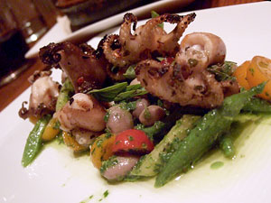 The grilled baby octopus made for a lovely little plate, with charred tentacles reaching up from a chaotically colorful pile of tomatoes, peppers and beans, all dressed with olive oil saturated with minced fresh herbs. (Basil and mint, perhaps? I was too busy enjoying it to pay careful attention.) In a rare moment of merely very good, I thought the octopi could have used a little more oomph -- of what nature I'm not certain. But they were perfectly tender with just enough char to bring some fire to the plate, and the focus of the dish, intentionally or otherwise, was the vegetables anyway, bright and crisp and tasting of sunshine.