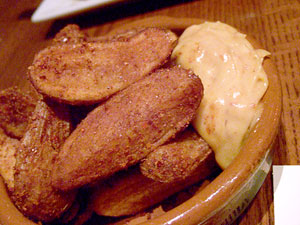 The pimentón spiced potatoes, not a favorite of the evening but entirely worthy, were described as sort of like patatas bravas, but that doesn't really give you the angle. "One-note" may be a derogatory term when talking food, but here I'm not so sure it isn't a compliment. The note in question was pimentón, the smoky ground hot pepper which absolutely dominated the dish in almost every possible way. Potato wedges were fried and liberally dredged in the stuff, then served with an aioli that had been flavored with the same. Where the padrón peppers were spicy, green and vegetal, the potatoes brought a different kind of heat, smoky and earthy, spicy with both a hit of heat up front and a smoldering tail on the back end. Sophisticated, no, but very bold and rather enjoyable.