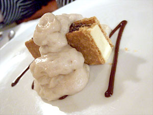 The practice of serving two different desserts to a couple is one fraught with peril. On one hand, it's always fun to be able to taste more dishes. On the other hand, if your company pulls the short straw and lands the lame dessert, the temptation to refuse the plate swap can run dangerously high. Thankfully, this was one of those perfect evenings where we both felt that we got the better end of the deal. Which isn't to say I didn't love her dessert, a peanut butter "parfait" that I put that in quotes only because I'm not entirely sure what the peanut butter component -- sandwiched between the two cookies -- was, precisely. It played a little like ice cream, but was unusually airy, light and dry. Peanut butter is so dominant a flavor that I thought it smart of them to dial it back a bit, and the filling wasn't overly strong. The big star, however, was the banana foam, a light but very wet banana modification that I'm having difficulty describing but no difficulty calling fantastic. It was one of those mind-bending "that flavor isn't supposed to feel like THAT" treatments, but handled effectively rather than as a novelty.