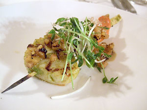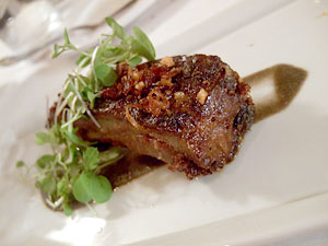 There was no muting the smoked pork rib that followed, however, as it was big and meaty and right there in the center of the dish. It was the dish, heavily spiced with a blend I won't begin to try to decipher, hit with crispy garlic and shallots and sitting atop a smear of huitlacoche. This was one of those Trojan horse of refinement kind of dishes, with which you could fool a bar food junkie into getting excited about something that was actually a complex balancing act of flavors. It was a brash, sweet, smoky, dig in kind of dish and my ladylove declared it her favorite of the evening. When some meat and potatoes fanatic (decidedly not my ladylove) says he doesn't go in for that froo-froo stuff, this is the dish you give him a taste of and dare him not to eat the rest.