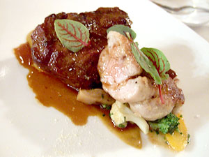 Our next dish was pork belly tortellini with squash blossoms and summer squash jus. And given the ingredient list, those who read this blog with any regularity won't be the least bit shocked that this was my favorite of the evening, but I assure you, it's not for the reasons you think. The braised pork belly filling was actually rather muted, clearly in a supporting role. The squash blossoms were lovely, to be sure. But what captivated me was the summer squash jus. And part of the reason it captivated me so was that it seems such an unlikely object of my affection. I always think of summer squash as an unexciting throwaway ingredient on a menu -- the stuff that gets sliced and thrown on the plate with your meat, or the boring anchor of a ratatouille. But the jus was just so bold and flavorful and unashamedly Summer Squash that I completely forgot it was a pork dish until midway through. I mean, really... when's the last time summer squash stole the show from pork belly?
