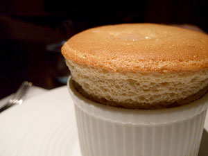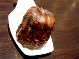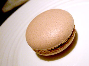 Gras then sent us off with some more traditional tastes of his birthplace, starting with a praline soufflé with vanilla, Frangelico and dark rum. This was a textbook preparation, light and moist and airy with a slightly crusty top, the sauce drizzled into a hole in the center so that the soufflé could soak it in. Mignardises included a little treat I'd read about but am embarrassed to admit I'd never tasted. Canelés are little (in this case, golf ball-sized) custards, poured into molds that look like elongated Bundt cake pans and baked until the outer edges turn a crisp, deep brown with a heavy caramelized flavor, while the interior remains pale and moist. It's a delightful textural and flavor contrast that I'm pleased to have finally tasted. And before our departure, a perfectly crisp/moist/gooey macaroon of the coffee and chocolate persuasion arrived to see us off.