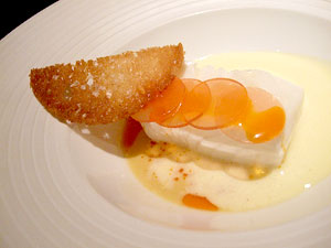 The next dish's flavors went off into left field a little bit, pulling corn and chorizo into a menu that had been almost exclusively French and Japanese up until then. The centerpiece was a slab of butter-poached halibut sitting in a bowl of creamy corn that acted as though it set out to become a custard and stopped halfway. Swirled into the corn emulsion was a splash of olive oil and a subtly but distinctly-flavored chorizo broth, and hidden in the bottom were a few stalks of white asparagus. On top were discs of chorizo gelée and a thin bread crisp. While the texture of the bread was certainly appreciated, I'm not sure that the gelée really had anything to contribute other than appearances. But as for the rest, while I'm ordinarily a little leery of any preparation that takes the teeth out of an inherently potent ingredient like chorizo, it really worked well and helped keep the focus on what was, unsurprisingly, a beautiful piece of fish.