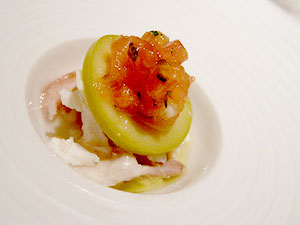 I'm not one to make a big deal out of bread service, but L2O's really is exceptional, providing six or seven selections in miniature form that are baked twice during the evening's service. What's more, though it seems a touch unnecessary, the butter is churned in-house, and it's delicious. Though it was tempting to make a meal of the bread, we managed to keep our consumption at reasonable levels (they only had to refill the butter dish once!) until the first dish hit the table, which was a bay scallop ceviche amuse with orange and parsley. It was clean little sweet and acidic shot, very heavy on the orange, that got us rolling nicely. This was followed in short order by another amuse, this one a clear shout out to Gras' roots on the French Riviera. A tender and flaky bit of halibut cheek, swimming in olive oil, was topped with a sliver of green olive and a dollop of tomato concassé. Given the ceviche's spiritual origins, I won't talk about this being an East-West setup for an East-West menu, though that interplay of bright, clean acid and more grounded, midrange flavors was certainly a little bit of foreshadowing.