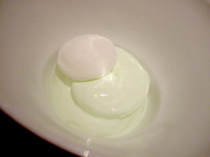 There's little better than when a dish rekindles my love for something I thought I'd grown tired of, and our second course was exactly that. I've almost completely given up on ordering raw tuna. In sushi bars, it's almost always a flavorless slab of fish-textured protein. When served as the ubiquitous tuna tartare, it's usually slathered with so much gunk that it's impossible to taste the fish (which, come to think of it, isn't so bad since it's almost always a flavorless pile of minced, fish-textured protein). These days, I only order raw tuna at places where it's guaranteed to be spectacular. And then only if I can get some otoro or something with a little fat on it for cryin' out loud. Our second course, however, reminded me that I can't stay mad at raw tuna. "Pristine" is so overused. What's more pristine than pristine? Immaculate, I suppose, though that's not much less of a cliché. In any case, we're talking full-on biblical-style immaculate diced tuna here, topped with a green he referred to as crystal ice lettuce, and MG-looking beads of soy, dashi and olive oil emulsions. On top, more tuna that had been frozen and sent through a Hawaiian ice shaver (no joke), topping ice cold with ice ice cold. This was a beautiful example of molecular gastronomy's positive legacy, a completely traditional collection of flavors put through the technical wringer and turned into something special. I loved this dish.