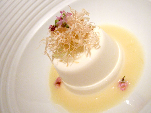 Our third course, though less striking, was quite lovely in its own right. Another Japanese-focused dish, it started with an exceptionally light and creamy block of house-made tofu, which was topped with itogaki (think shaved bonito, but a less aggressively flavored version made with bluefin tuna) and shiso blossoms, and sat in what was termed a miso "bouillon". That the tofu was so delicate dictated that the other components would be as well, making the more refined itogaki a thoughtful substitution rather than a merely pretentious one (though I'm not certain the same can be said of the imported shiso blossoms). The miso bouillon was similarly mellow, avoiding the sweet trap and letting the tofu come through, as it should if you're going to go to the trouble of making it yourself.