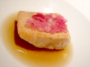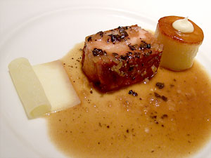 It's tough to have a scallop with caramelized cauliflower and not think of Jean-Georges Vongerichten, and that may very well have been the intention. And though this was one stunner of a scallop, I'm not sure that sauvignon blanc-passionfruit-vanilla will be usurping caper-raisin as my favorite sauce for this particular pairing, but an excellent dish nonetheless. Our first truly substantial piece of fish was my sole disappointment of the evening. Robota-yaki (Japanese wood-grilled) Coho salmon with breakfast radishes, watermelon radishes and a ginger-beef bouillon, though beautifully prepared, was just far too subtle for my tastes. Balanced, yes, and it's nice to see radishes featured so prominently and so well, but to me it just played a little flat.