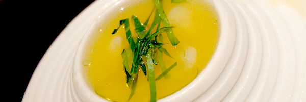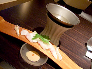 The basic menu is a four course prix fixe, and in addition to the kaiseki menu served in the tatami rooms, there are two tasting options, a 12-course seasonal menu and what Gras calls his Tête à Tête: an eight course tasting where each plate features two very minimally presented ingredients that are supposed to create an unusually harmonious whole. And while the concept of the Tête à Tête was intriguing, it's hard not to do a basic seasonal menu on your first pass, so we did. Though not exclusively of the sea, there's no doubt that this is fish-focused fare, right down to the glossary (yes, the glossary) of Japanese fish terms that accompanies your menu (apparently there are some pretentions I could do without). Gras is French by birth and training, and that's clearly where the menu is rooted, but it works in a horde of Japanese influences in both low and high-tech manner. Browsing through Gras' blog, it's impressive how much MG hardware has made its way into L2O's kitchen. Even more impressive is how casually much of it is integrated, but I'm getting ahead of myself.