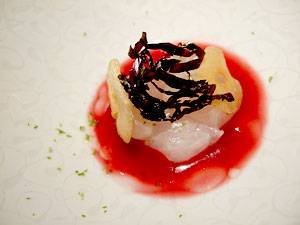The menu's first official dish was the first of two raw seafood preparations, a fluke sashimi in an iridescent umeboshi vinaigrette with what appeared to be some type of dried seaweed, crispy fried garlic slices and a light grating of zest from some sudachi, a limelike Japanese citrus fruit. Umeboshi, for those who may not be familiar with it, is a type of pickled Japanese plum, but don't let that fool you into thinking there was anything sweet going on here. Umeboshi is incredibly sour, very salty and pungent, and a big surprise the first time you taste it. This dish was no exception. And between the puckering vinaigrette and garlicky garnish, I was a little surprised that the fluke held its own, but it absolutely did, that clean, fresh flavor somehow cutting through the noise. A good start.