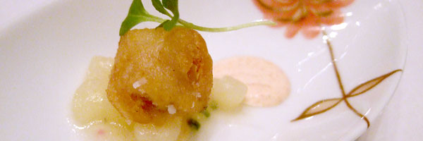 That Fleur de Lys at Mandalay Bay qualifies as old, at this point, pretty much sums it up. I've stayed at Mandalay a number of times, and been burned by Aureole almost as many, it seems, so when looking for an early evening option close to home that skewed more towards the traditional end of the spectrum, checking out Hubert Keller's Vegas outpost struck me as the logical conclusion. And if only because I needed to take a little step back from Top Chef while I could, I passed on the menu highlighting his dishes from Masters (his salmon from the finale was notably absent) and instead, I actually ordered a la carte at a high-end restaurant for the first time in as long as I can remember. First taste out of the gate was a cod fritter amuse with potato salad and cayenne mayonnaise. Crisp and hot tempura-style fish and a little zip from the mayo were nice, but the key was a heavy shot of vinegar in the potato salad, keeping it bright and punchy.