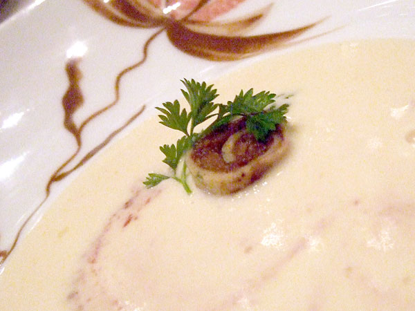 The truffled onion soup looks very nice, especially the streaks of wine reduction, although the "crepe" looks more like a garnish than anything.