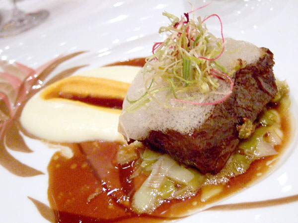 To start, I went with a simple soup... as simple as truffled onion soup with braised duck crepe and red wine shallot puree gets, anyway. It played simply, though, taking a sweet and unexpectedly creamy angle that still didn't feel as though it had been drowned in dairy. This was an onion soup, not a cream soup, deepened by the red wine reduction that swirled throughout when the soup was poured tableside. The duck-filled crepe, while it seemed like a fine idea, was kind of superfluous. It was tiny to begin with, it got lost in the flavor of the soup, and a soft crepe around shredded, stewed meat didn't provide any kind of textural contrast whatsoever. But as an onion soup, this delivered. I wanted big onion flavor and I got it, even if the truffle was borderline AWOL.