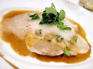Wow, the one thing that struck me is that I would have been really disappointed to spend that kind of money for a meal at a restaurant like that, and then to get a bunch of super-thin, dumpling-skin ravioli all clumped together (just like my mom used to do!). It seems like such an amateur hour mistake of execution, either in cooking or service (not getting it out fast enough).