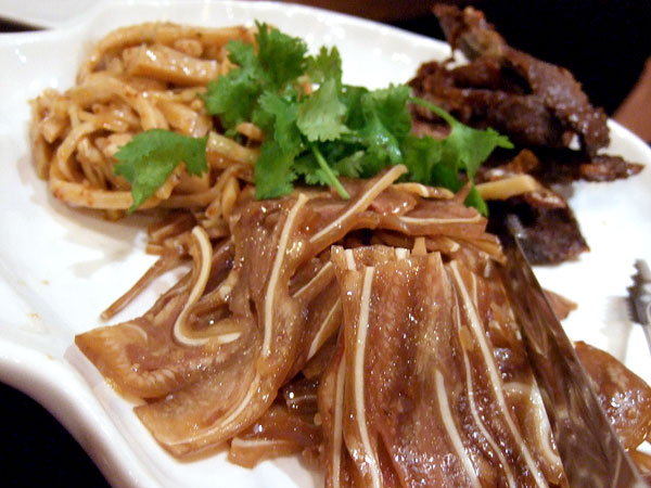 Jo Jo TaiPei is one of the obscene number of little ethnic joints crammed into Allston, and it's a very small, cozy and comfortable place that's open late and has a huge menu. This is always a good start. Foodwise, we got started with a selection of what I could best describe, for lack of the actual term (which I'm sure somebody will reveal in the comments) as Taiwanese panchan. Our server brought out a large platter of chilled items from which we selected three. Thinly sliced pig's ear in sesame oil was a little tougher than I would have liked, but was simple and tasty, nonetheless. Pickled bamboo was tart and spicy, but the most interesting, hiding in the rear right corner of the photo, was some manner of fish, I believe, that had been transmogrified into something almost meaty. The seasoning was heavily soy-based, it had been dried to create a very dense, chewy and almost jerky-like consistency, and then smoked.