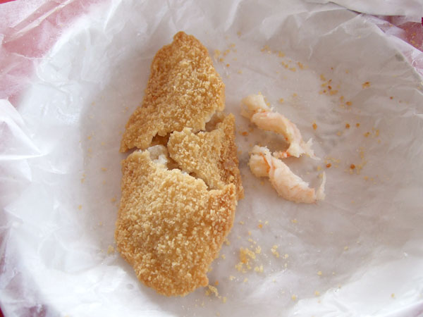 Gilmore... nope, that's the fish on top. Actually, come to think of it, this is mislabeled. The chips aren't pictured. Sitting underneath the fish are some fried shrimp, which were more of a joke than the fish. Here's a photo of one, extracted from its cocoon: