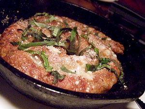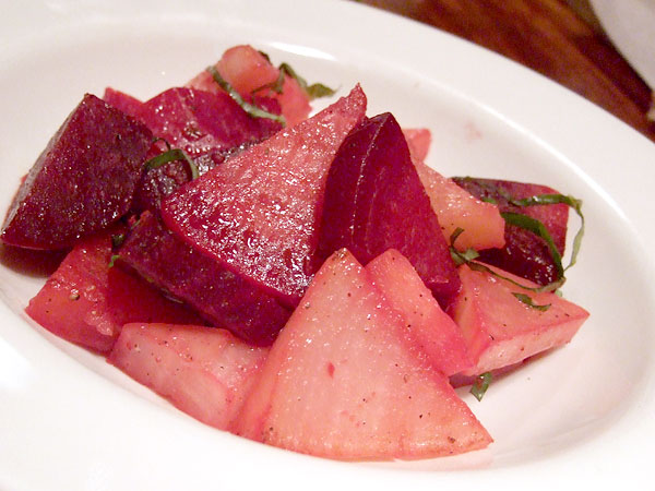 Our other starter, on the other hand, was really quite enjoyable. A long length of fennel sausage was coiled up in a small cast iron skillet, seared hot and crispy and hit with a little sharp cheese and fresh basil. It was big, bold, unabashed flavor, nicely presented, and though I should have thought better of it, I even took some bread to the pan drippings left behind after we'd demolished the sausage. My only regret was that we didn't order some kind of bitter, leafy green dressed with olive oil and lemon juice to go alongside it. That would've made the perfect pair. We did, however, have some roasted beets which -- simply roasted and salted with a little fresh basil atop -- wouldn't have passed the David Chang Test, but I didn't mind. Give me some good roasted beets and I'm a happy camper.
