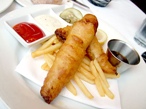 While my ladylove went with a beet and blood orange salad -- perfectly delicious, if exactly what you'd expect -- I attacked their bay shrimp cocktail. It's got some punch, which wouldn't have surprised me if I'd bothered to do my research and learned that the chef/owner, Eduardo Martinez, is a native of Mexico. It may not be what I think of as your run-of-the-mill mariscos (because, you know, I've traveled extensively through Mexico and am an authority on such matters </sarcasm>), but that's clearly where it is in spirit, with tomatoes, avocado, lime and plenty of chiles. A good shrimp cocktail. Too bad half of the chips were chewy. Sticking with the seafood vibe, I'd been craving fish and chips ever since the Pete's Fish & Chips fiasco, so that's where I went for my main. Three cigar-shaped fingers of freshly-battered cod came on a pile of thin and crispy fries, with all of the usual suspects for dipping. I'm not sure if the fact that it came across as a little more refined than your average F&C was a function of substituting champagne for beer in the batter, or the fish's slender torpedo shape, but it felt just a little fancy. Pure fish and chips at its heart, well-executed, but with a touch of refinement, reflecting its environment. We enjoyed Market. It wasn't especially memorable, but it was a perfectly pleasant and classy lunch spot for a gasto-vacation.