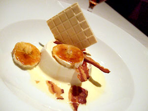 Dessert took advantage of what I consider to be one of the coolest foods ever, Lactarius Rubidus, the candy cap mushroom. I actually wrote about candy caps a while back, including a recipe for the dessert that clinched Iron Chef Mushroom for me. Candy caps are a pretty typical-looking and tasting red mushroom when fresh, but as they dry, they take on an intense maple flavor. Make something with powdered candy cap mushrooms, and people will swear up and down that there's maple syrup in it. While I did cheesecake, Humphries did a panna cotta with caramelized banana and candied bacon. Maple, banana, bacon... of course it worked well. And while the surprise that I expect catches many was lost on me, I loved seeing a great use of one of my favorite ingredients.