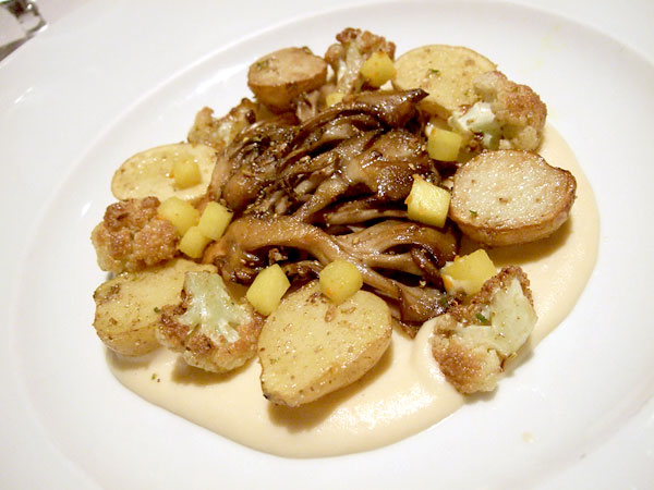 The star of the menu, a singular fist-sized Grifola Frondosa (hen of the woods or maitake), was dropped into an Indian-spiced palette. Sitting atop a creamed cauliflower puree with potatoes, caramelized cauliflower florets and diced turmeric-spiced apple with cumin, cardamom and some other usual suspects, I believe, the mushroom itself was really beautifully done. Pan-roasted, it had taken on a very deep, intense flavor and the edges -- of which there are many on a maitake -- had been lightly crisped to provide a great texture. The combination of flavors was certainly no great reach, but the dish was beautifully prepared and presented, and I appreciated that the chef took pains to design a satisfying dish, which is always a little more difficult when it comes to vegetarian entrees.