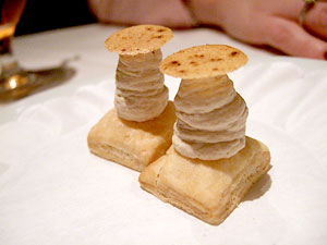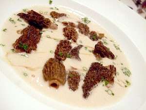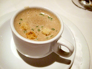 Of course, this meant that my dinner selection was a foregone conclusion. Well, except for one issue. In puzzling fashion, the cream of mushroom soup that's become something of a house signature dish isn't actually a part of the mushroom tasting. Huh. No matter. Next to its listing on the a la carte menu is an option for a demitasse serving of the soup for $3. Perfect! We'll start with that, please. Though in fact, we started with an amuse of button mushroom mousse on puff pastry with a porcini crisp. A silky mousse bracketed by two crisp elements, the button mushroom's uncomplicated flavor shining through, it was a very nice amuse and I especially like that Humphries doesn't hesitate to utilize the lowly button mushroom. We then moved on to the cream of mushroom soup, which probably deserves its reputation. The mushroom flavor is potent, derived -- I suspect -- from a careful mixture thereof, and it's matched by a bracing jolt of sherry, yet the soup isn't so heavy as to be cumbersome. Served scalding hot with a light froth on top, the demitasse cup somehow seemed even more appropriate than a bowl.