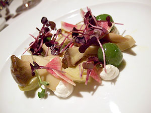 My first course of the mushroom tasting, Pleurotus Eryngii, could, I suppose, best be described as a salad, but only in the broadest sense of the term. It consisted of olive oil poached king trumpet mushrooms with dabs of whipped mascarpone, artichoke, slivers of radish and enormous olives, dressed with Meyer lemon. Unsurprisingly, given Humphries' reputation, the mushrooms are skillfully handled. The olive oil poaching preserves their delicate flavor and dense texture, making them rather satisfying as the centerpiece, which they are. The centerpiece, that is. Which is something I greatly appreciate. Though strewn about with a myriad of (well-matched) compatriots, there was no question about what anchored the dish.