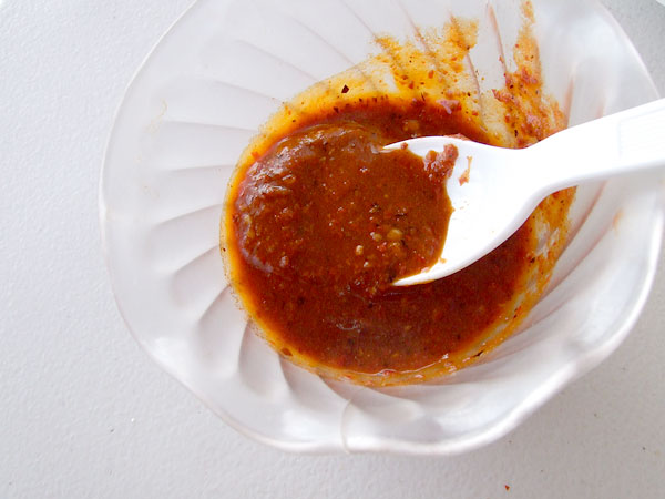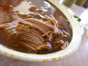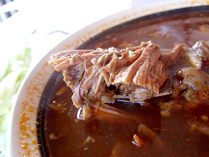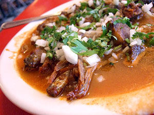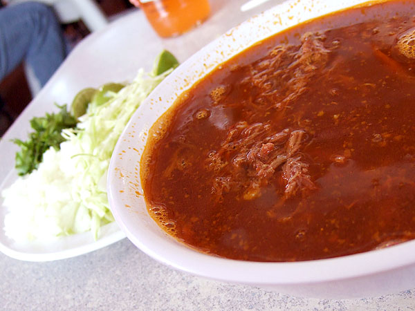 Birrieria El Gordo, erroneously listed in a number of places as Birrieria El Gorvo, isn't the most pleasant of restaurants. It's cave-like and a little dingy, lit by exposed CFL bulbs of competing color temperature. So of course it ended up being one of my favorites. This was a really delicious, nicely-rounded broth with a great, full flavor, and the meat was a great improvement over Del Yaqui and Obregón. Rather than the stringy, lean meat of those two, these were moist and tender chunks of goat. And though many will not consider this a positive, the fact that there was a good deal of silky fat and connective tissue made it even better. The broth was easy on the chiles and, to my palate, in need of a little more heat, but the red salsa -- mostly pureed chiles with a little vinegar, I believe -- was a great complement to the broth, unlike the salsa served at Del Yaqui. The vegetables at El Gordo are served from a bar up front, and distinguish it slightly from the others. As well as offering chopped radishes and cucumbers, both the cabbage and the onion and cilantro mix are finely shredded, cearly with a food processor, rather than minced and sliced by hand. While I prefer the texture and body that the latter provides, El Gordo's approach wasn't entirely without merit. It had the effect of almost acting like a thickener, making the dish feel less like a soup and more like a stew. But again, not to my preference. Even considering, however, El Gordo ended up being my favorite of the five.