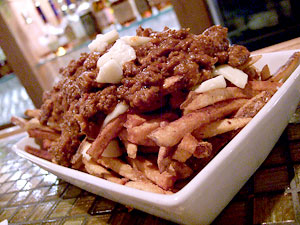 Thankfully, it paid off. Though Petite Maison's website features their staff meal quite prominently, in practice it was simply a matter of walking in, parking at the bar and asking what they had that night. On this particular night, it was but two dishes. A "BLT" and... chili cheese fries. At a French bistro? Huh. Ah, well. I lived two blocks from Bob's Big Boy in Burbank, California for five years. I'm no stranger to late-night grease bombs. Bring two of the former and one of the latter, we said, in perhaps not so eloquent a fashion. The "BLT" was a rather loose riff on convention, thin crispy bacon on a brioche bun with endive and sweet -- very sweet -- tomato confiture. My compatriots quickly identified the bacon as the work of The Meat Shop, and that fine product was well-accompanied. "BLT" might be stretching the limits of the term a little bit, but it was a tasty little sandwich.
