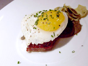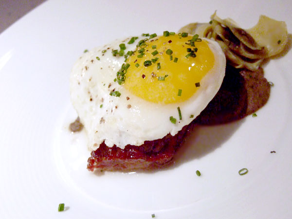 Briny Kumamoto oysters received a treatment far more elaborate than their resultant flavor would suggest, and that's a good thing. When you see that they're dressed with yuzu, chili gelée, micro shiso and fresh wasabi, you wonder if there's going to be an oyster buried in there somewhere. But the additions complement both the oysters' flavor and their provenance, gentle Japanese touches accentuating rather than standing in the way of the salty little critters. Braised(?) boar bacon, accompanied by artichoke leaves and a lentil puree, was barely visible, peeking out from beneath a fried egg with a vibrant yellow and deliciously oozy egg yolk, but its shyness was a ruse. Big, porky flavor was its true character, the inherent saltiness of the bacon mitigated by that luscious egg yolk. A fusion of two food trends (bacon and fried eggs) that are getting a little ubiquitous? Ehhh, who cares. Great flavors, and the menu's better for it.