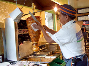 The branch I hit was located in Cuauhtemoc, which struck me as a rather comfy neighborhood, streets lined with trees, lush parks every few blocks, and a far cry from the dingy urban sprawl that is the impression many folks have of the city. El Tizoncito -- this location, anyway -- is a small corner shop tucked into a residential neighborhood, a comfortable place to park and have a beer and some eats, with tables and chairs out on the sidewalk and a fellow carving the beautiful cone of pork right on the edge of the sidewalk, for everybody to see. The pork was densely layered, bright orange and rotating in front of a box filled with live coals. The gentleman tending it wielded a blade that looked more like a small saber than a kitchen knife, and he'd use it to quickly shave a few thin layers of pork into the tiny tortilla in his left hand, before a quick flick of his wrist sent a chunk of pineapple flying from the fruit impaled atop the cone, which he'd deftly catch in the center of the tortilla down at waist level where he was holding it. Unfortunately, he was in the middle of filling an order of what must have been thirty tacos just as I walked up, which meant that the outer char had been completely stripped from the meat. But I wasn't about to turn around and head back, so I ordered two tacos and a coke and grabbed a seat.