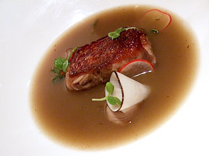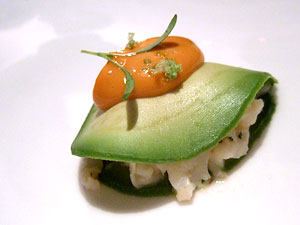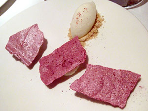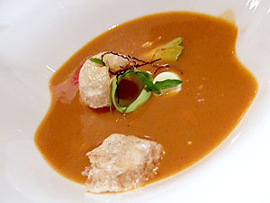 The fourth dish was tortilla soup. Tortilla soup! Now it was almost as though he was showing off, taking the most basic foods he could come up with simply to prove that he could turn them into fine dining material. And he did admirably. Though this was one of the evening's humbler entries, it was nonetheless atypically delicious, a velvety, spicy stewed tomato concoction that tasted as though the flavor of two bowls of tortilla soup had been compressed into one. For an extra dimension, both in terms of flavor and texture, he served the soup with crunchy chicharrones, their airy pockets soaking up some of the soup while still maintaining their crunch. I wouldn't call this dish a highlight of the meal, but it took tortilla soup to unusually refined heights, and on that basis alone it was very, very successful.