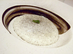 When the third dish arrived, I briefly considered the possibility that we'd received the wrong item, but you can rest assured that there's a tamale in there. It was a small one, composed of masa and huitlacoche, the corn fungus that routinely makes lists of challenging foods for reasons I'll never understand (it tastes like a particularly earthy breed of mushroom -- what's the big deal?). It was buried, however, in a somehow perfectly-shaped foam bubble that was made with a fresh, sour farm cheese. That the dish was visually arresting goes without saying, but for me this was a great example of non-gratuitous foam use, because it allowed him to integrate that very naturally sour cheese while at the same time lightening its impact so that it didn't kill the huitlacoche and natural sweetness of the corn tamale which, incidentally, was beautifully warm and tender.