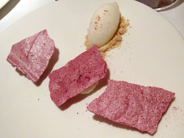 The final savory dish? Pork and beans. Really. The pork was a sizable braised cut, with deeply colored skin and tender flesh that still maintained some resistance. Though some smashed beans were present, they mostly served to create the broth, a bold and earthy but still very clean and refined consommé that, if you still haven't caught onto the theme here, took a very classic and humble flavor combination to an unusual level of refinement. Spicy shaved radish, avocado and micro oregano rounded out the garnishes, and though I loved the dish and thought the pork was spectacular, this was the only one that left me wanting a bit, for some salt or acid or something to add a little bit of sharp contrast to the very deep, earthy, base flavors of the main ingredients. Spicy pickled radishes were, I think, going in the right direction, just not quite far enough. Still, a very good dish.